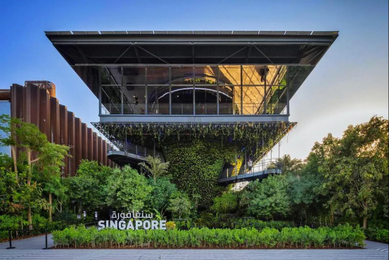 新加坡馆的设计旨在向世界介绍它“自然之城”的愿景。设计师将具有新加坡特点的植物作为生态圈的主要结构来帮助减小建筑本身对自然环境的影响。在绿荫的笼罩下配合隐藏在馆内的干雾扇可以为游客在高温中降低至少6℃的体感温度。