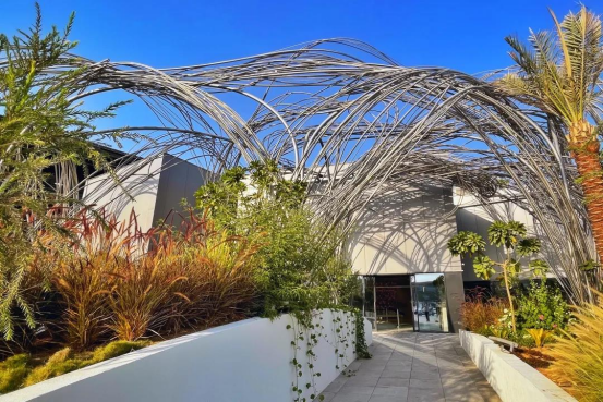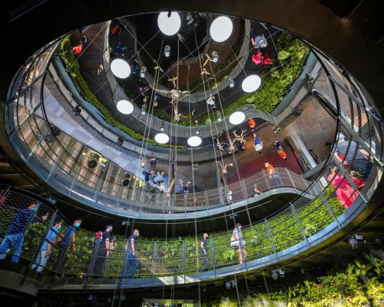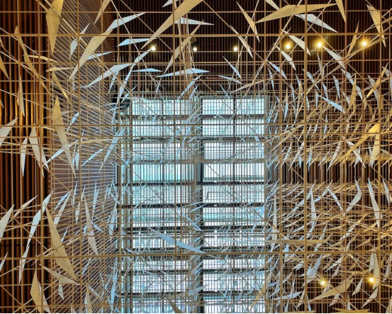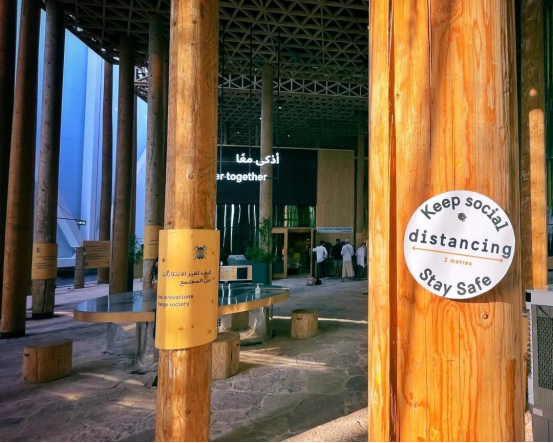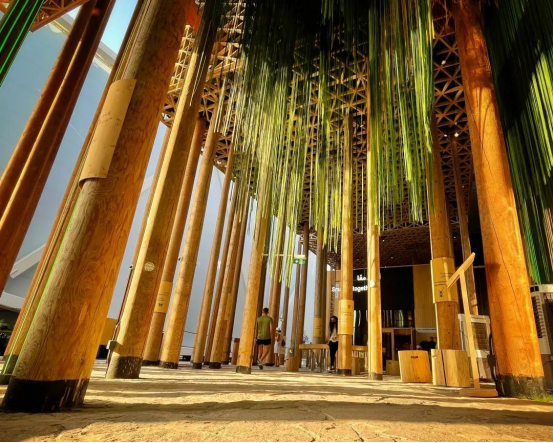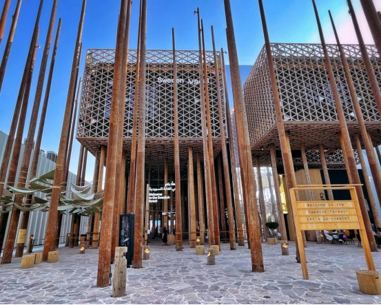 相关负责人员介绍道,“为了将这片最具有代表性的原始森林带入迪拜世博会,瑞典馆使用了300颗取自当地的云杉树用作主展馆的框架。”在瑞典,每砍伐一棵树需要种植两棵树来帮助森林资源的保护。瑞典馆不仅严格遵守了该项规定,还自发的多种植一棵树来表达对可持续发展意识的支持。树干间紧密的排列不仅可以保证建筑的稳定性,还巧合般的构成了2米社交距离,以此提醒来访游客时刻注意防疫要求。
