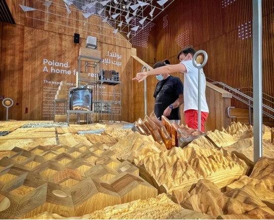 波兰馆依靠于树状的建筑结构外形,以可回收材料制作的动态飞鸟,承载着友谊从北欧平原飞向阿拉伯世界。