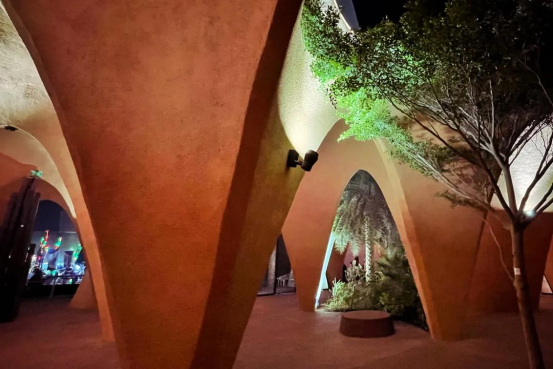 高耸的彩色圆锥结合西班牙本土创意和阿联酋的沙漠色彩在骄阳的照射下熠熠生辉。锥形的建筑结构可以促使空气流通,把周边的高温空气从顶部降温后缓慢下沉到底部,用节能环保的方式为馆内游客带来清凉,让来访者享受到自然和色彩的双重体验。