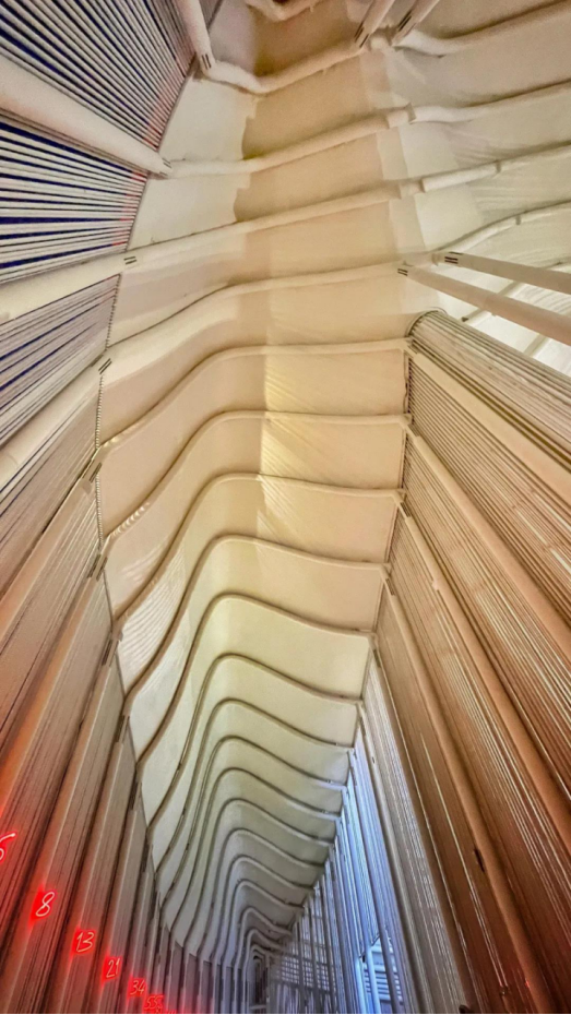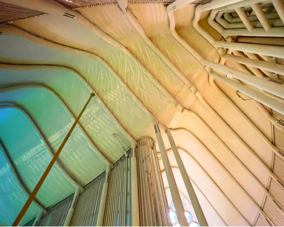 超过150根垂直柱体支撑起的钢制船梁构成了意大利馆的整体框架,而这个巨型船梁将会在展馆拆除的时候继续完成它未完成的使命。