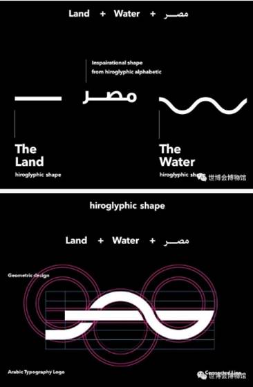 印章设计提取象形文字“大地“与“水”环绕交织,即寓意了古埃及文明的产生和发展同尼罗河密不可分,也象征着过去与未来的呼应融合。